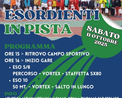 Programma Gare:Ritrovo ore 15.00 c/o Centro SportivoChiusura iscrizioni ore 15.30Inizio gare ore 16.00 con il seguente ordine per categoria:Esordienti 10 Femminile: vortex, 50, lungo.Esordienti 10 Maschile: 50, lungo,…